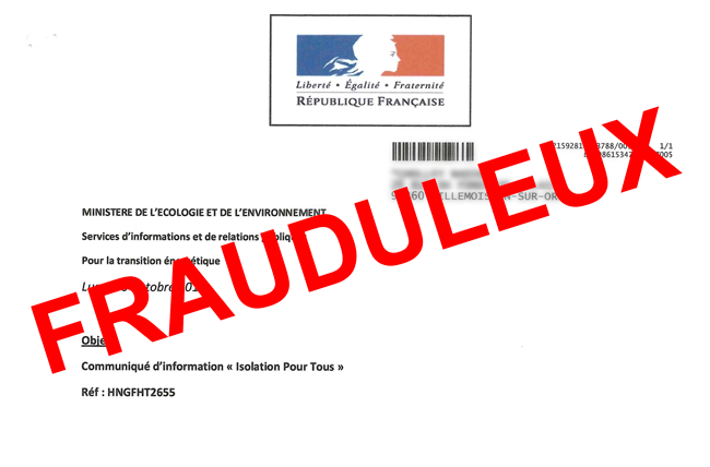 De nombreux habitants ont reçu un courrier personnalisé à en-tête du ministère de l’écologique et de l’environnement (ce qui n’est pas le nom actuel du ministère) promettant la rénovation thermique à 1 euro. Ce courrier incite à appeler un numéro qui renvoie à une plateforme téléphonique et qui n’est absolument pas un numéro officiel du Ministère.